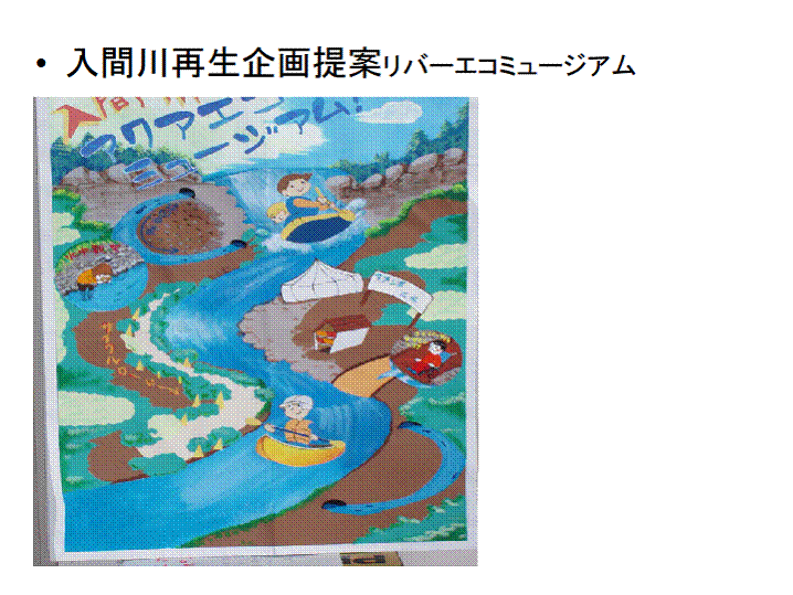河川再生提案項目 1、魚道観察水路の拠点整備 2、常設水遊び講習会場の設置 3、沈下橋とヤナバの設置(阿須の渡し) 4、ダム直下のカヌー国際競技場の整備 全てソフトプログラムを充実させる 5、長期計画名栗ー豊水橋間散策路 市民マラソン・サイクリング・ウオークラリー